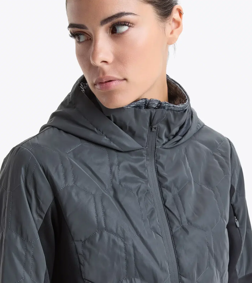 Diese Laufjacke für Damen besteht aus reflektierendem Material und verfügt über eine Primaloft-Wattierung mit unterschiedlichem Gewicht je nach zu schützendem Bereich. Diese Art der Wattierung wurde entwickelt, um Wärme ohne Volumen sowie Leichtigkeit, Komprimierbarkeit, überragende Weichheit und Atmungsaktivität zu gewährleisten.