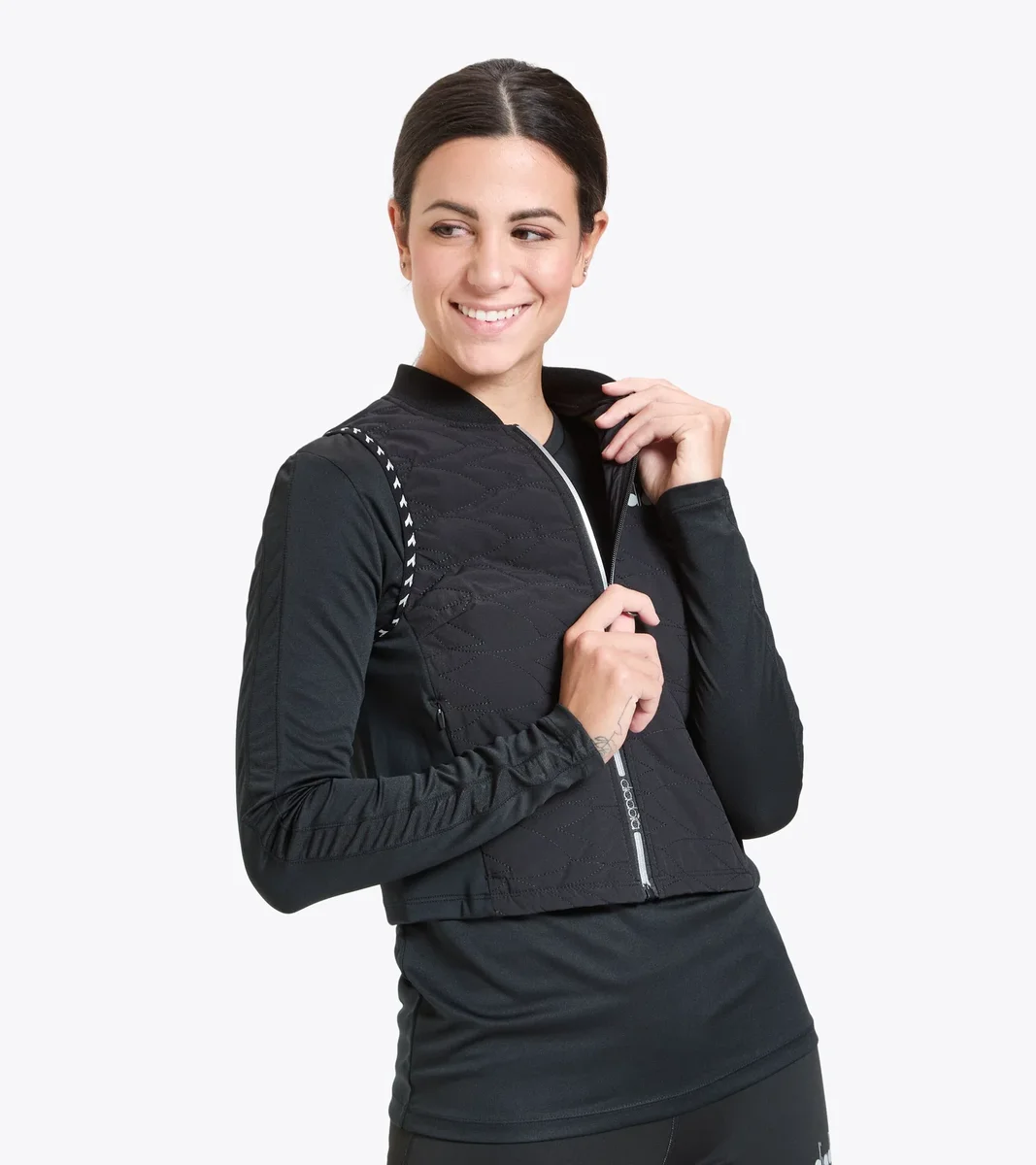 Die L. Urban Vest Be One ist eine Windjacke für Damen aus winddichtem Material mit leichter Primaloft-Wattierung auf der Vorderseite und Multi-Fregio-Steppung. Mesh-Einsatz auf der Rückseite und reflektierende Details.