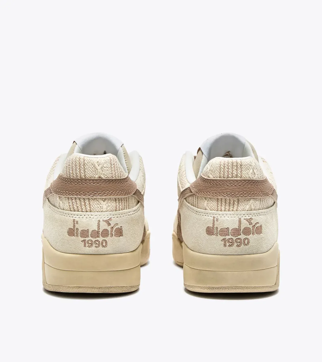 B.560 Boho: Dieser elegante und raffinierte Sneaker verfügt über ein perforiertes Obermaterial aus Leder im Zehenbereich und aufwendig gewebte Stoffdetails an den Seiten und an der Ferse. Eine leichte Wachsbehandlung verleiht dem Schuh einen authentischen Used-Look, der dem Heritage-Stil treu bleibt.