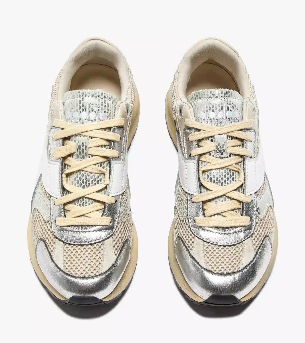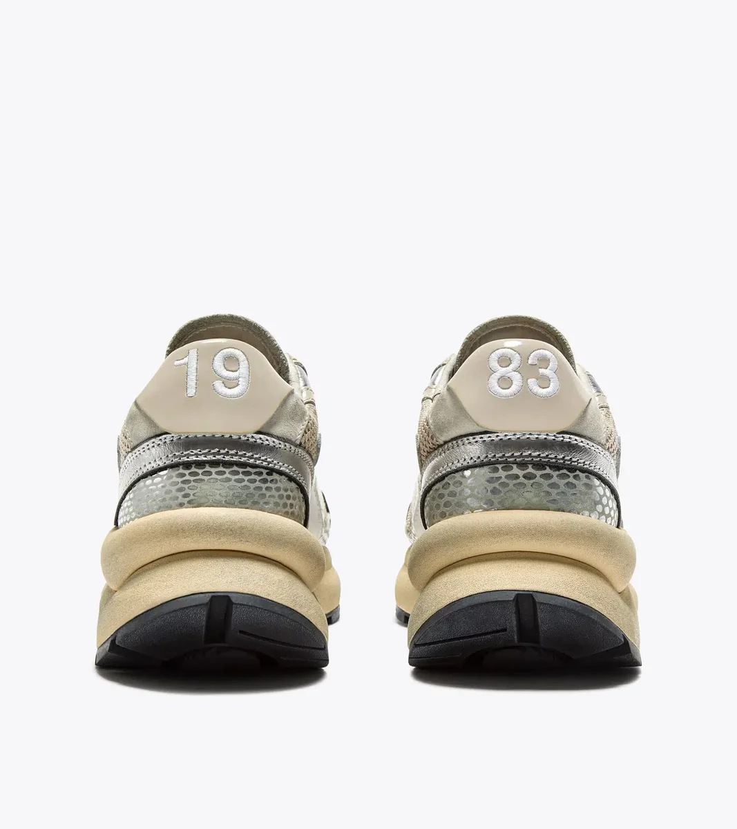 Das ultraleichte Mesh glänzt mit einer glänzenden Oberfläche, während das metallische Leder mit einem auffälligen Schlangenprint-Muster die Blicke auf sich zieht. Diese mit Stonewash und Wachs behandelten Sneakers sind wie geschaffen, um Ihre Sehnsucht nach dem klassischen Sportstil der 70er Jahre zu stillen.