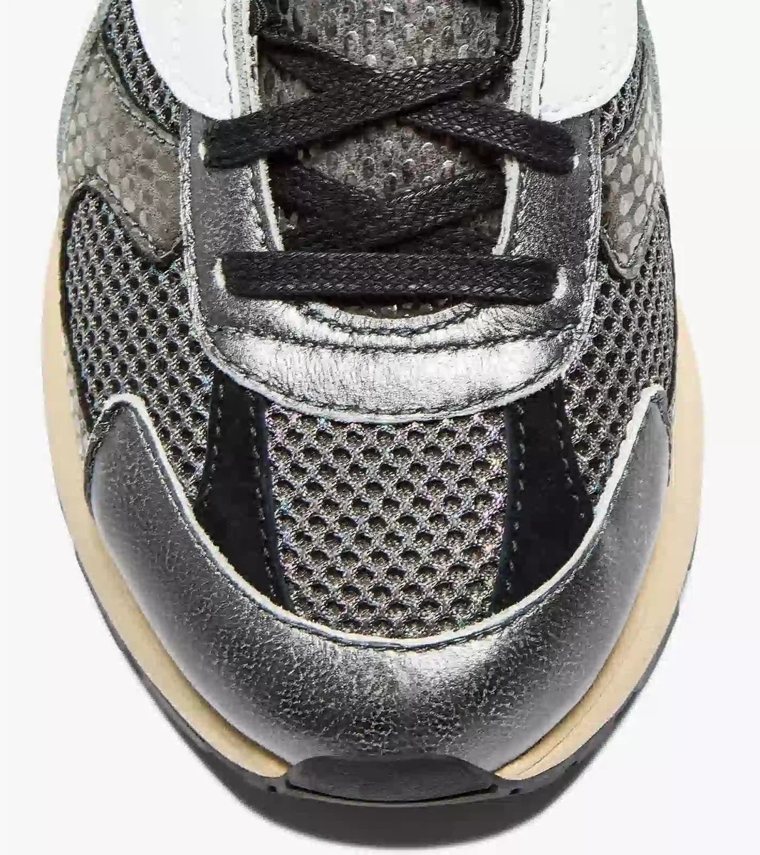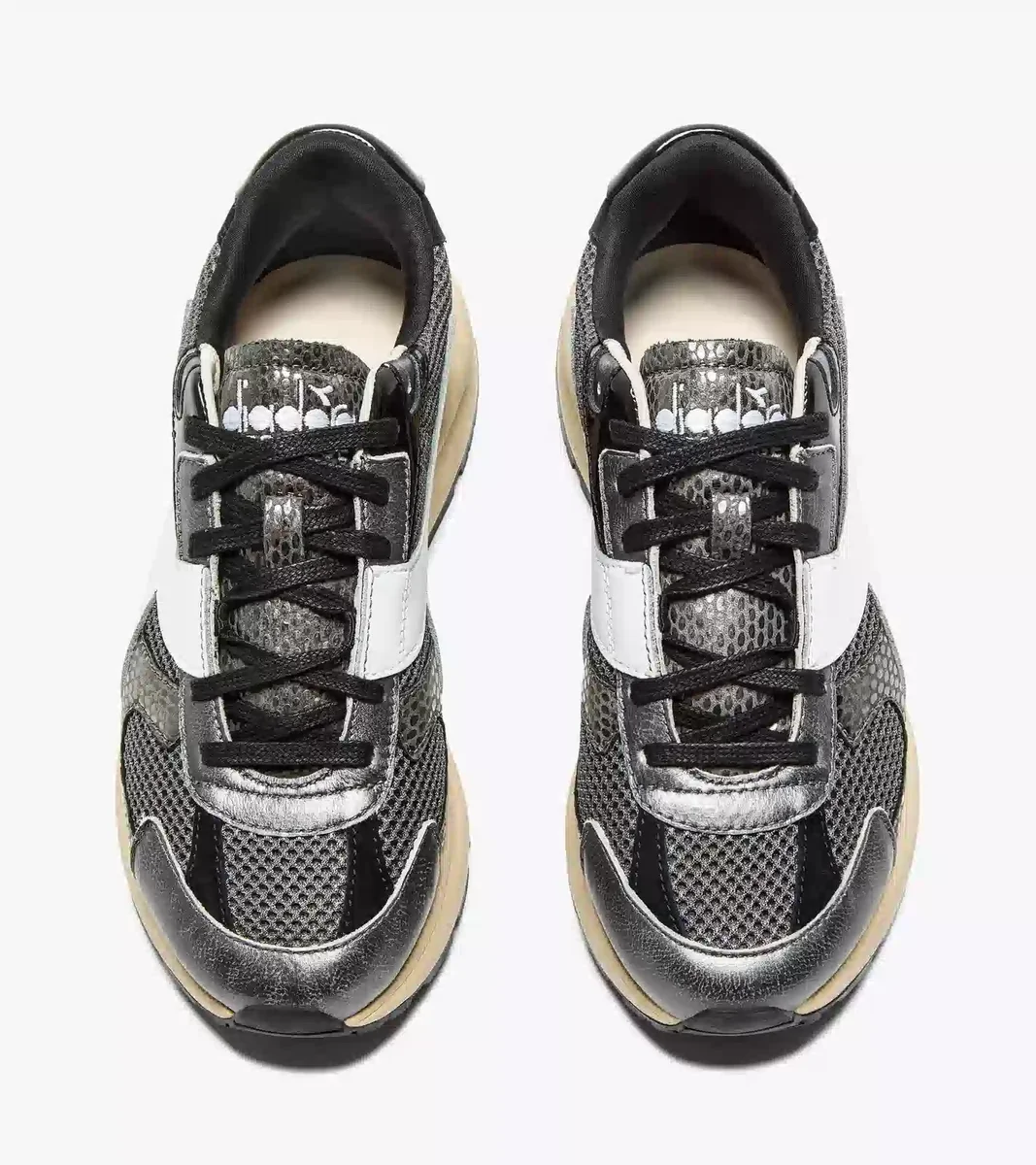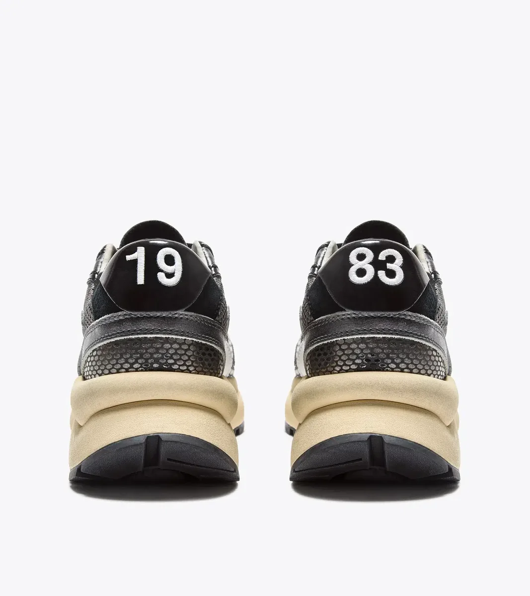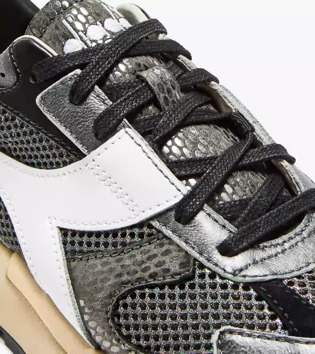 Das ultraleichte Mesh glänzt mit einer glänzenden Oberfläche, während das metallische Leder mit einem auffälligen Schlangenprint-Muster die Blicke auf sich zieht. Diese mit Stonewash und Wachs behandelten Sneakers sind wie geschaffen, um Ihre Sehnsucht nach dem klassischen Sportstil der 70er Jahre zu stillen.