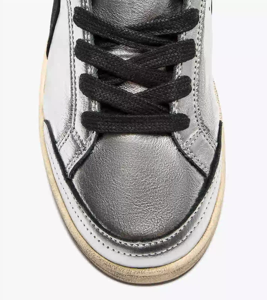 Der Prestige High Metal Used ist aus laminiertem Leder mit Details aus Schweinsleder gefertigt. Die Stonewash-Behandlung macht das Material weicher, während ein leichtes Wachsfinish dem Schuh seinen unverwechselbaren Used-Look verleiht – ein Markenzeichen der Diadora Heritage-Linie.