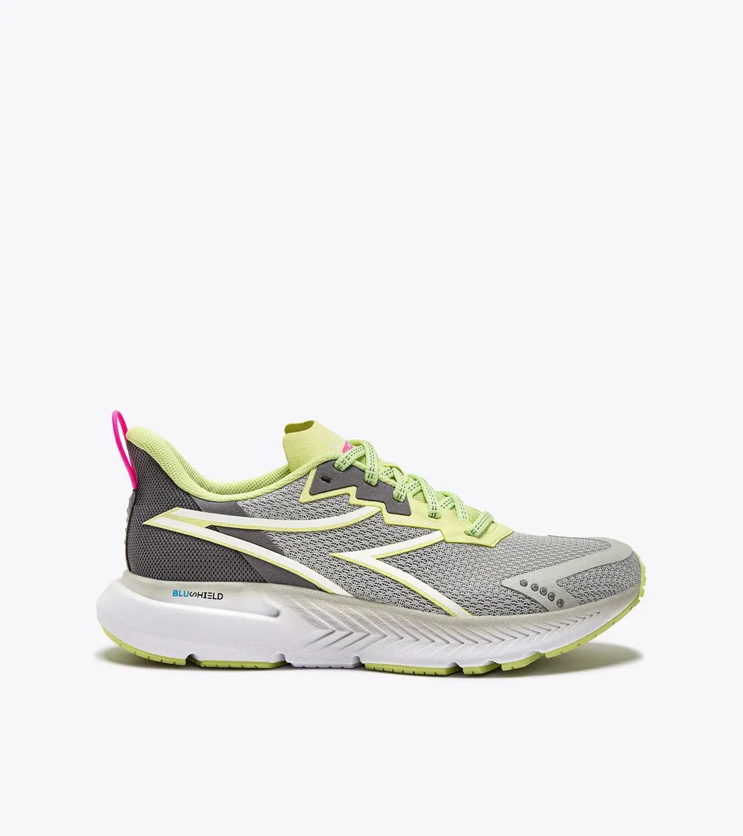 Der stabile, leichte und schützende Volo vereint zwei Technologien von Diadora: Anima sorgt für einen leichten und reaktionsfreudigen Schuh, während die Blushield-Technologie die Asymmetrie des Fußes ausgleicht und so die Effizienz beim Laufen verbessert. Darüber hinaus verfügt er über einen für Damenschuhe üblichen 9-mm-Absatz.
