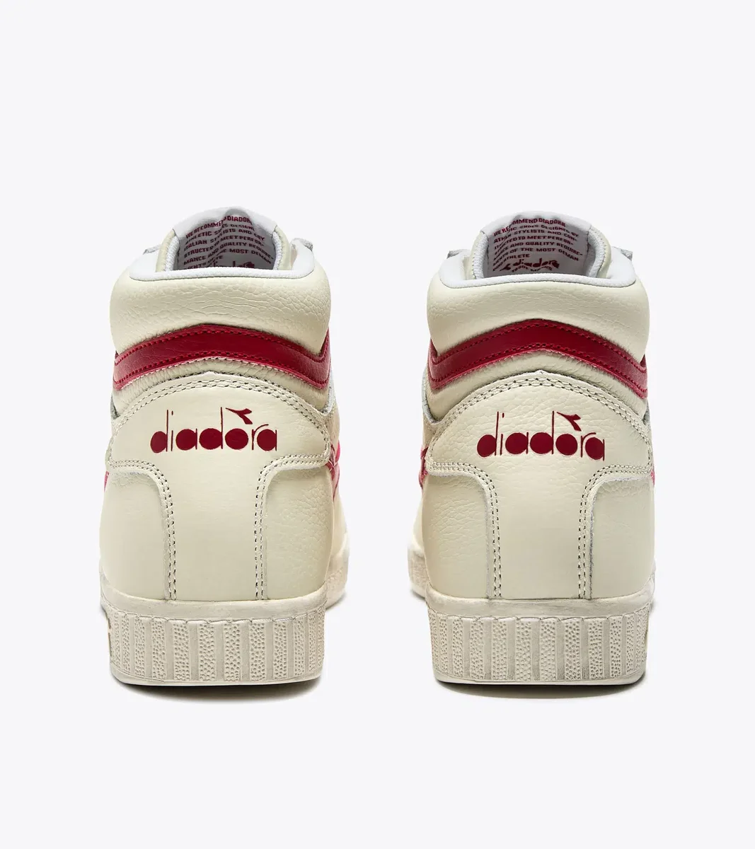 Das ikonische Modell Game L High ist aus hochwertigem Leder mit Wachsbehandlung gefertigt. Wie alle Ikonen von Diadora besticht dieser Schuh durch seine sportliche Ästhetik und seinen zeitlosen Stil, der zu jedem Anlass passt. Unisex-Modell mit kontrastierendem 5-Ball-Logo und Fregio-Detail.