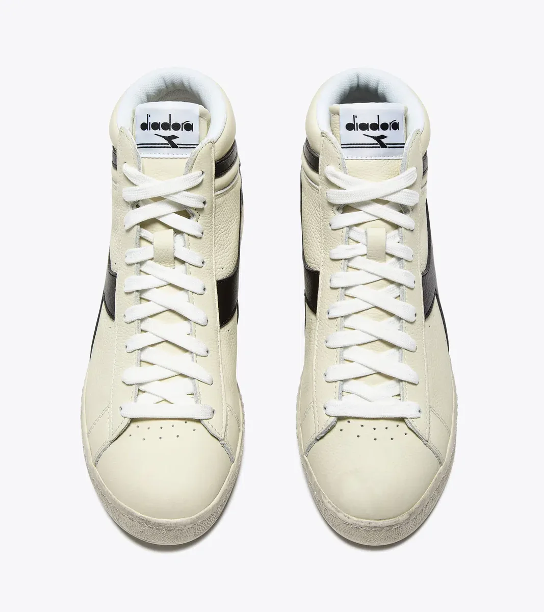Das ikonische Modell Game L High ist aus hochwertigem Leder mit Wachsbehandlung gefertigt. Wie alle Ikonen von Diadora besticht dieser Schuh durch seine sportliche Ästhetik und seinen zeitlosen Stil, der zu jedem Anlass passt. Unisex-Modell mit kontrastierendem 5-Ball-Logo und Fregio-Detail.