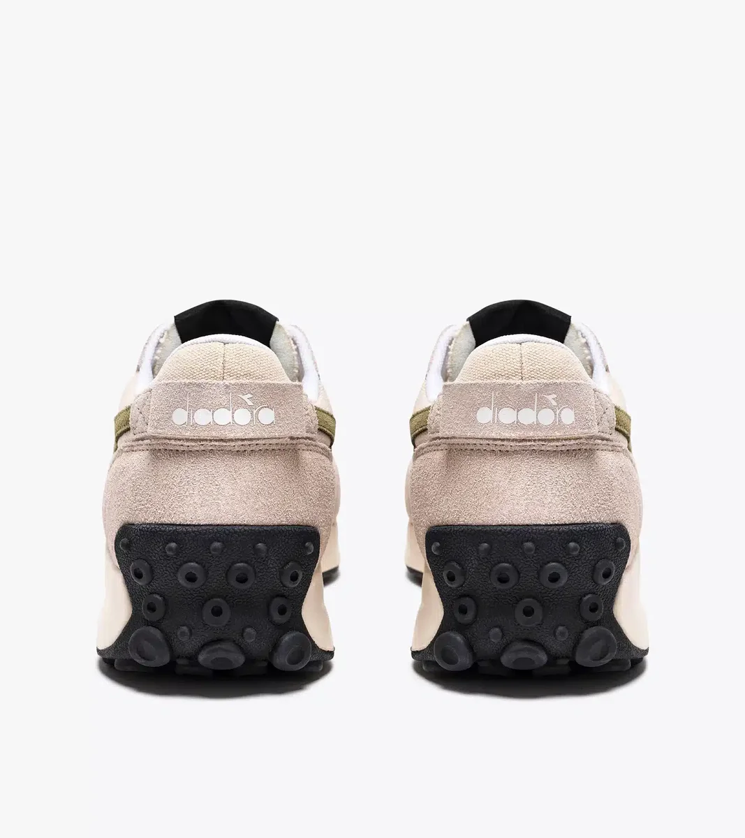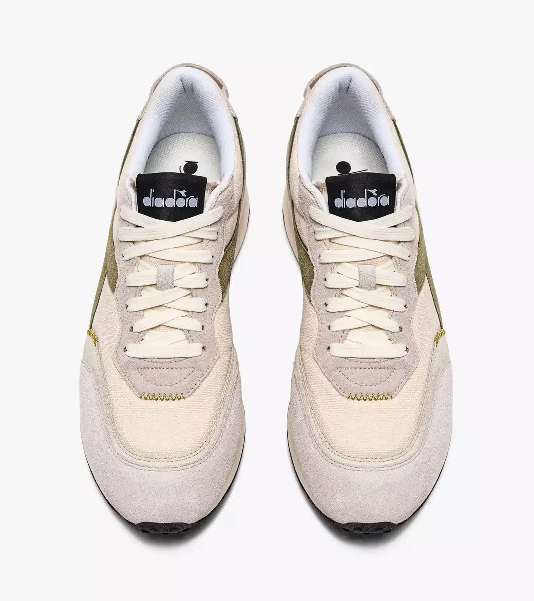 Race Suede SW, ein klassischer Laufschuh aus den 80er Jahren, feiert ein Comeback, um das sportliche Erbe von Diadora zu würdigen. Die Sohle ist eine originalgetreue Nachbildung des Originals, während das Obermaterial in einem zeitgemäßeren Stil neu gestaltet wurde. Der Canvas-Stoff an den Seiten und am Vorderblatt ist gewachst und erhält dadurch einen faszinierenden Used-Look.