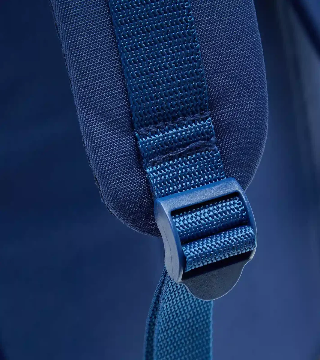 Praktischer Rucksack mit halbstarrer Struktur aus Polyestergewebe mit Mesh-Einsätzen an den Trägern. Zwei Seitentaschen und ein funktionales Frontfach, in dem ein Schläger transportiert werden kann.
