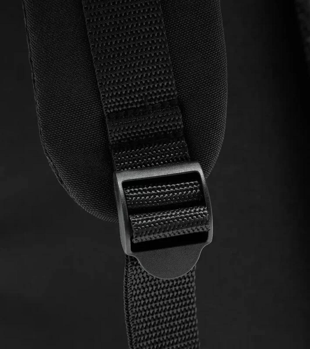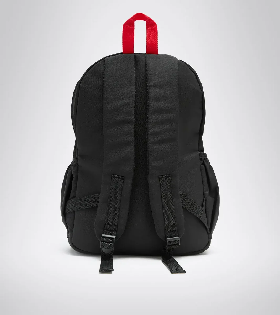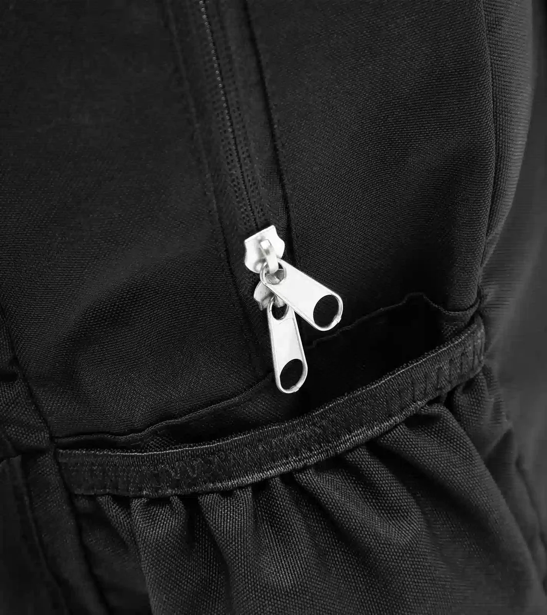 Praktischer Rucksack mit halbstarrer Struktur aus Polyestergewebe mit Mesh-Einsätzen an den Trägern. Zwei Seitentaschen und ein funktionales Frontfach, in dem ein Schläger transportiert werden kann.