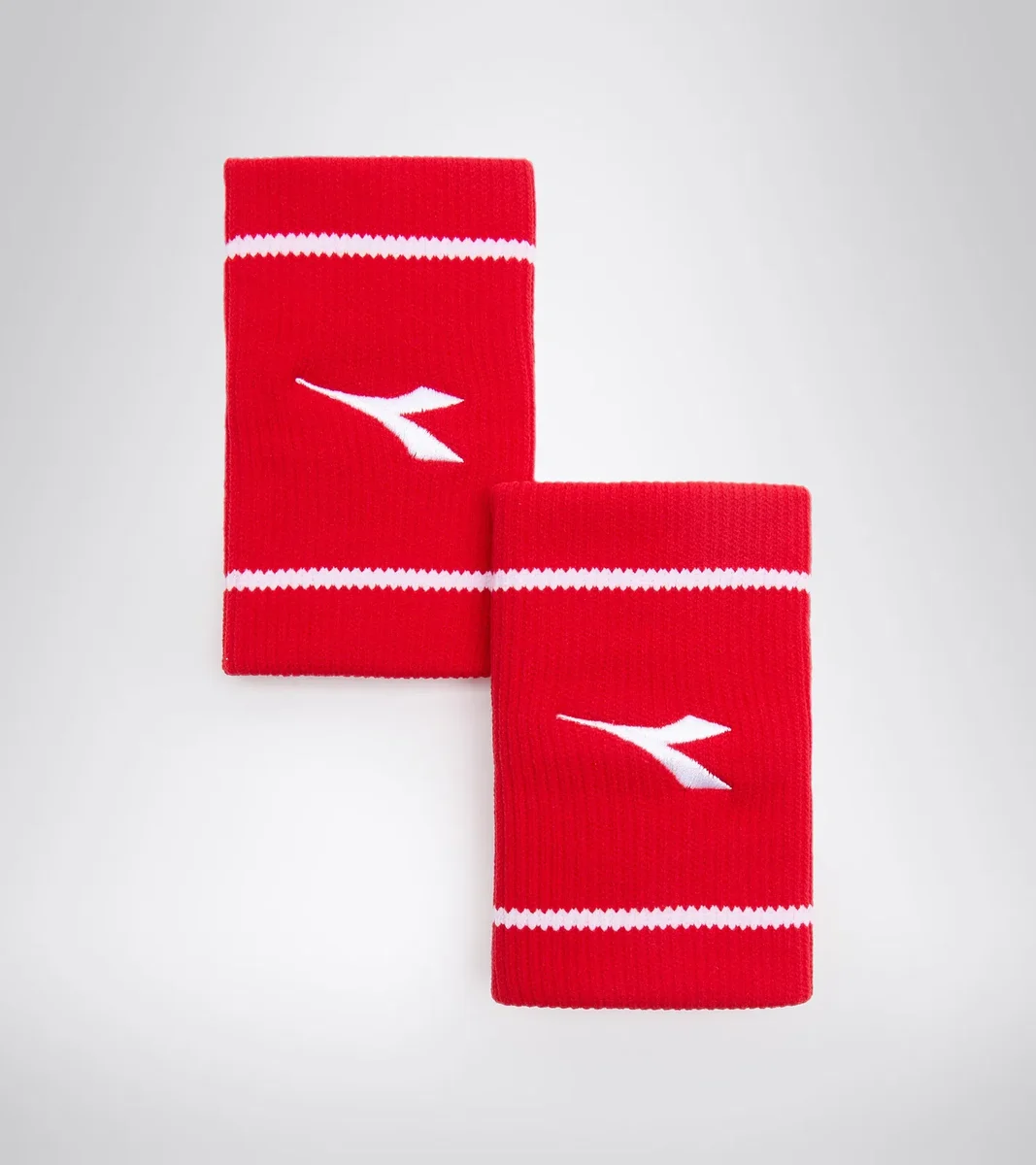 Breite Unisex-Schweißbänder, das perfekte Accessoire für Ihre Tennismatches. Aus Nylongarn, mit kontrastierender Stickerei und dem ikonischen Diadora-Fregio-Detail. Erhältlich in Rot und Schwarz.