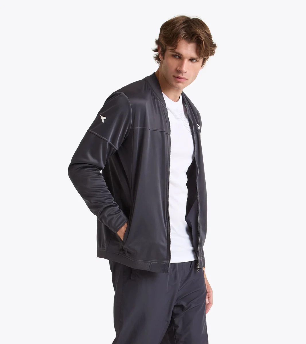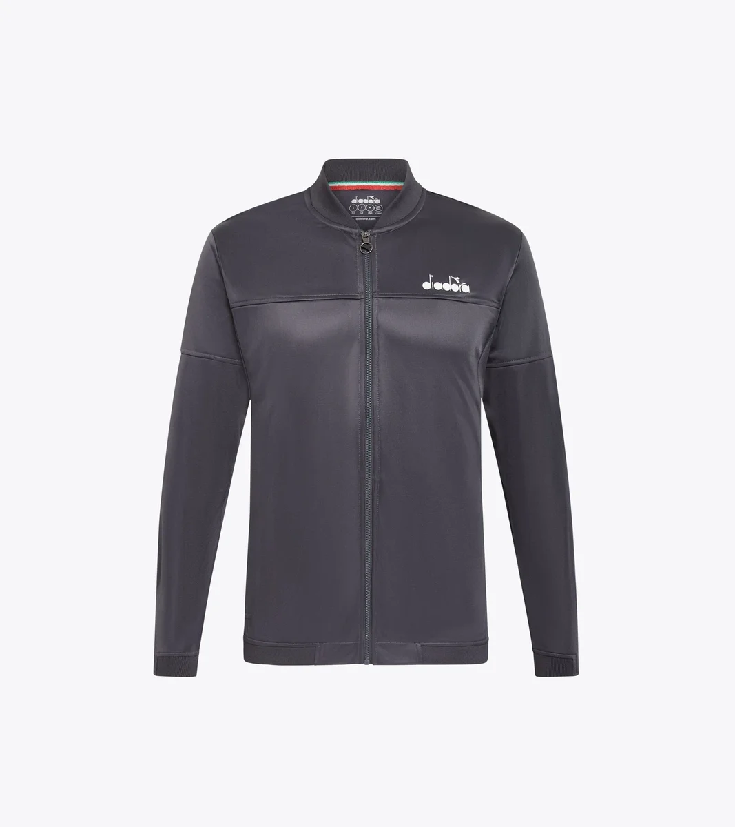 Jacke mit durchgehendem Reißverschluss aus glänzendem Polyestergewebe, gerippten Details an Ärmelbündchen und Saum, Kragen im College-Stil. Diadora-Logo auf der Brust und Fregio auf dem Ärmel.