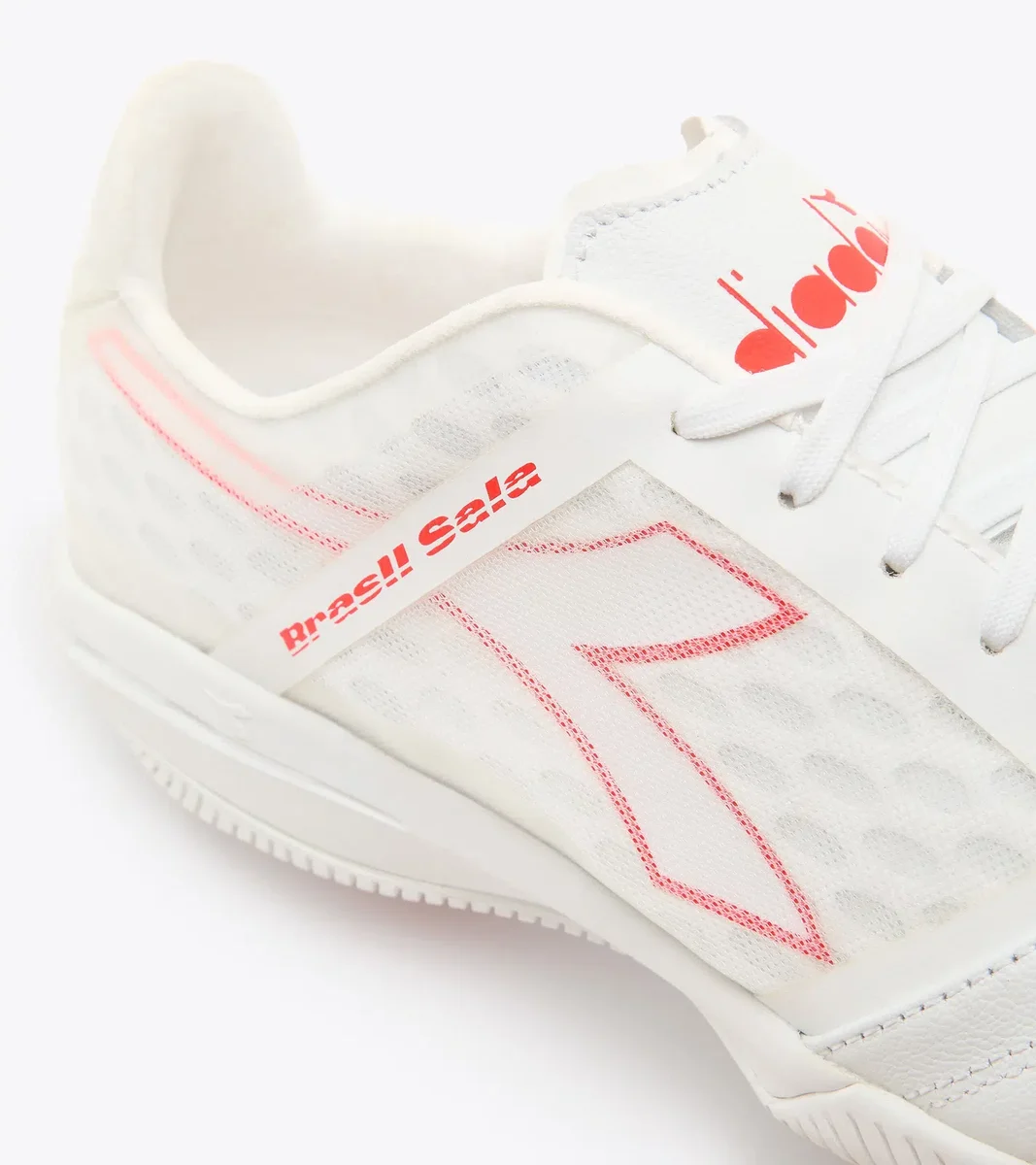 Brasil Sala ID ist ein Futsal-Schuh für Herren mit asymmetrischem Design, der ein ultraweiches Lederfutter mit einem atmungsaktiven Mesh-Obermaterial kombiniert und so für Atmungsaktivität und Leichtigkeit während des Spiels sorgt. Spezielle Gummibeschichtung an der Zehenkappe mit abriebfestem Grip-Effekt, kratzfeste Gummisohle und „Ergo-Stop”-Form an der Rückseite der Sohle, um das Stoppen des Balls zu erleichtern. Modell geeignet für Hallen- und Parkettböden.