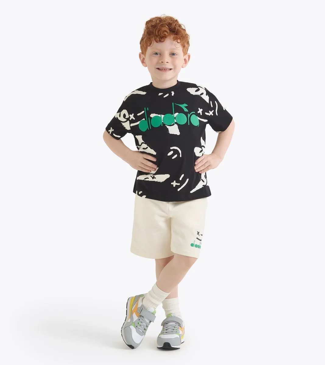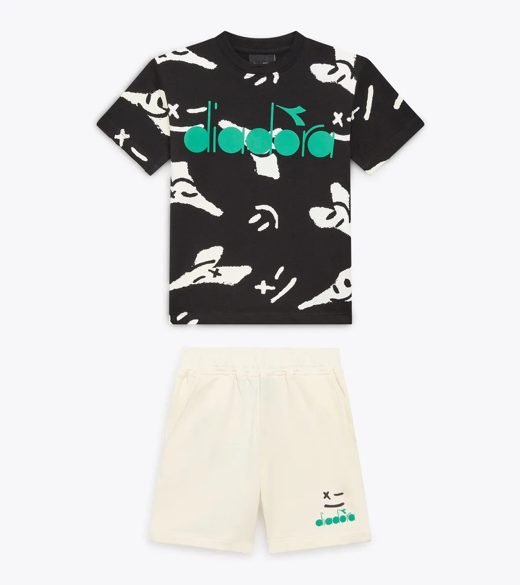 Machen Sie die Freizeit Ihrer Kinder bequem und unterhaltsam. Dieses sportliche Outfit besteht aus einem ironischen T-Shirt mit Smiley-Motiv und passenden Shorts, die die Farbe der kontrastierenden Logos auf dem T-Shirt aufgreifen. Ein Sportset für Jungen, das sofort einsatzbereit ist.