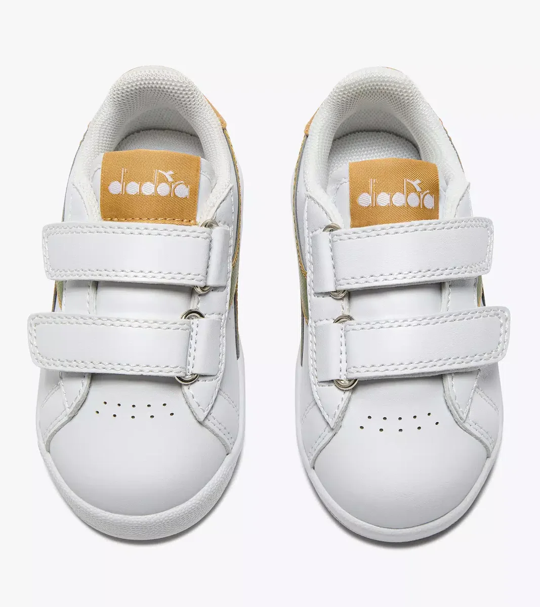 Niedriger Kinderschuh, durchbrochene Details, praktischer Klettverschluss, passender Fregio, Zunge und Rückseite.