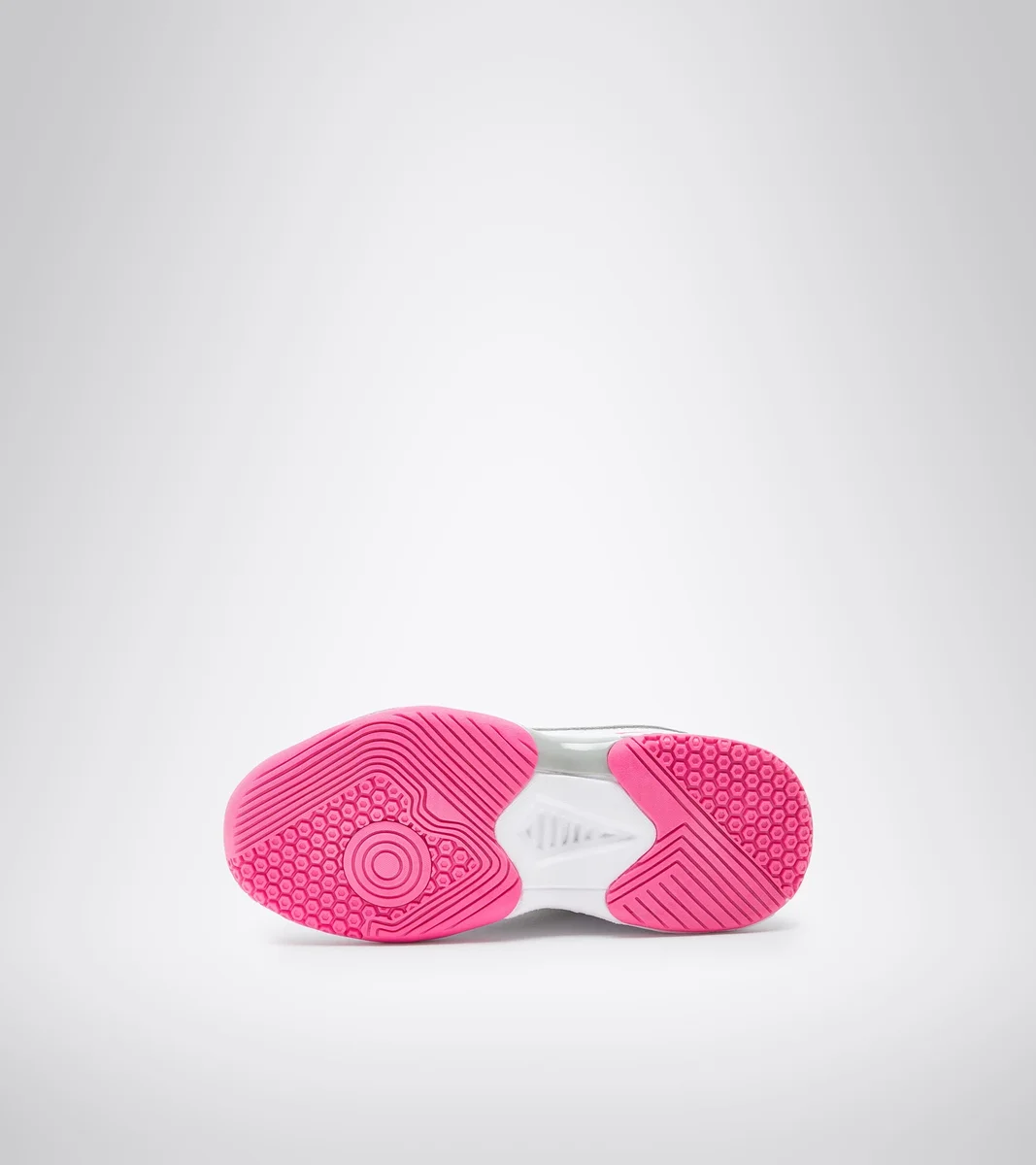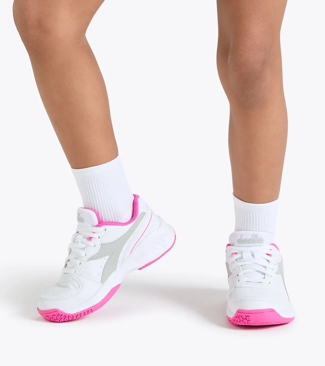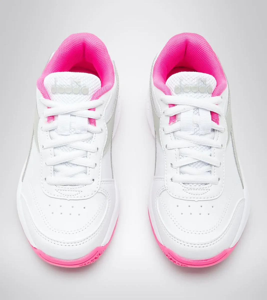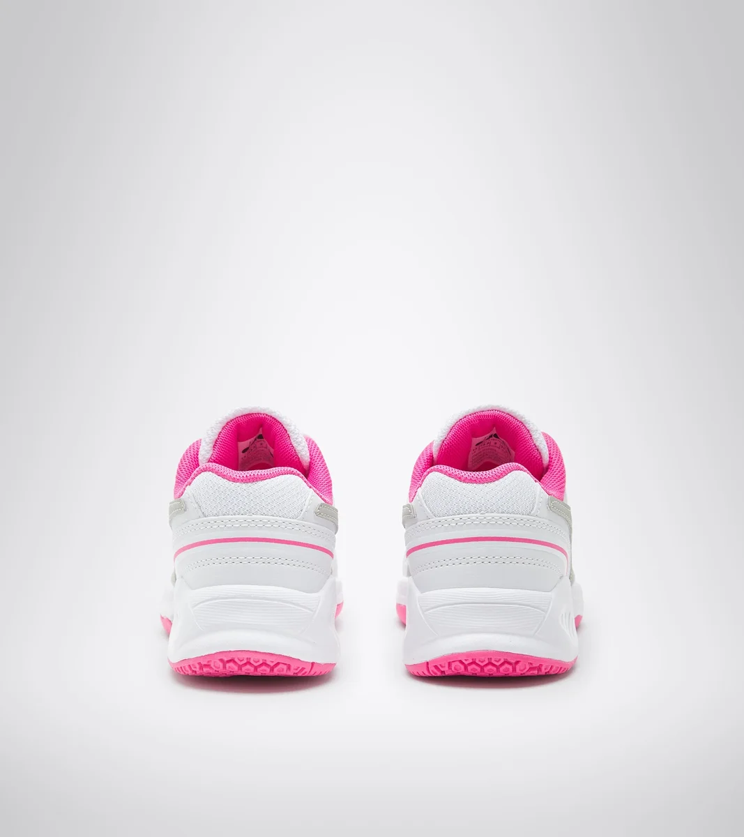 S. Challenge 4 SL JR ist ein Unisex-Tennisschuh für Junior-Tennisspieler, die gerade erst anfangen. Er verfügt über eine TPR-Sohle, SuprellTech und Mesh-Obermaterial, Baumwolljersey und EVA-Schaumstoff-Einlegesohle sowie eine bedruckte EVA-Schaumstoff-Zwischensohle mit C.C.B.